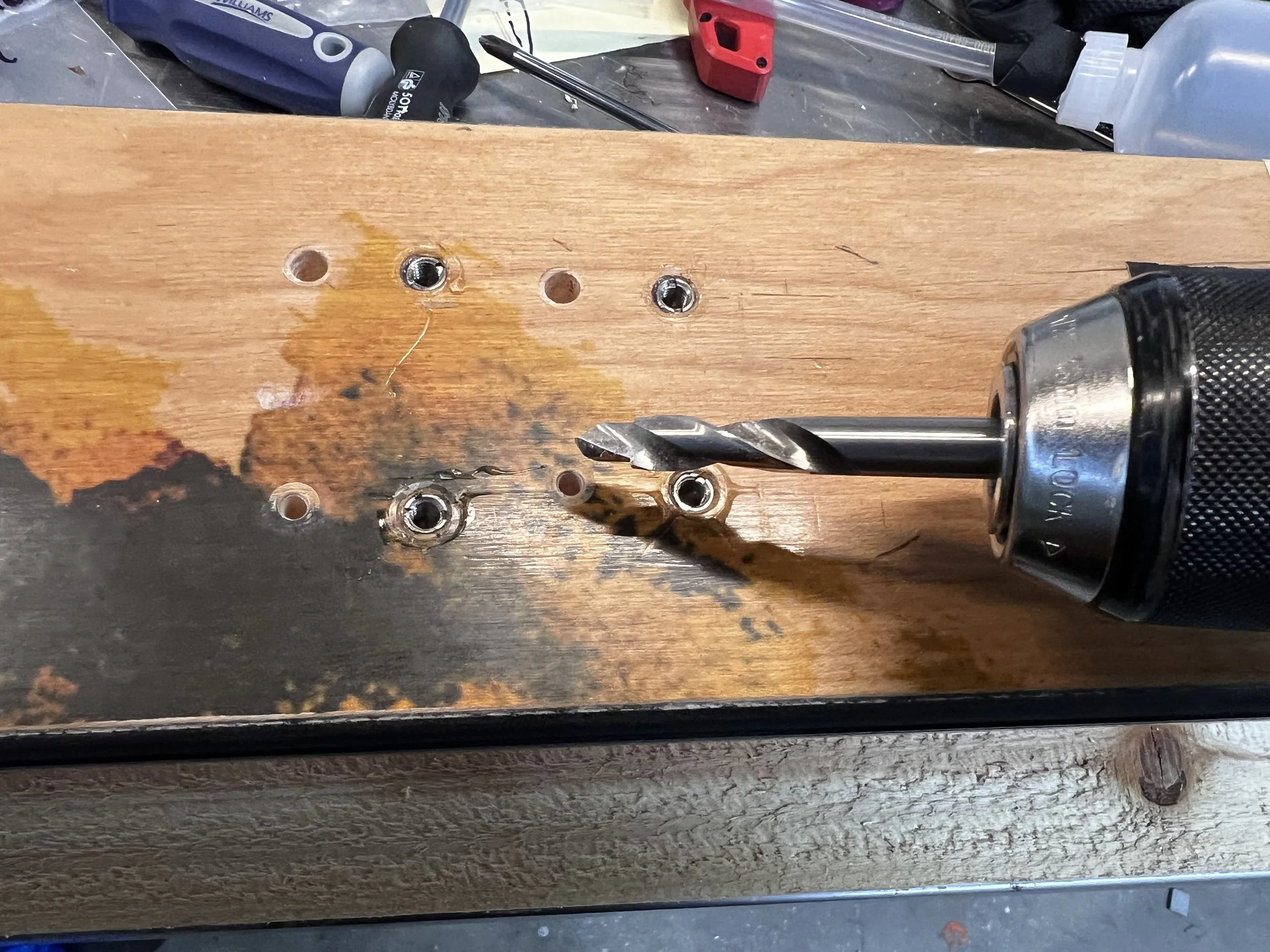 Drill out each of the smaller 3.5mm holes with the step bit, expanding the hole to 6.5mm.